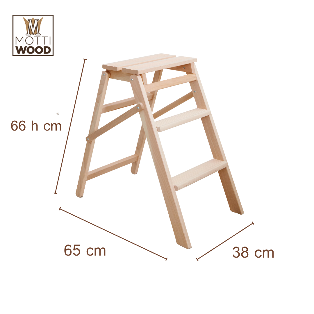 Lo scaletto in legno di faggio naturale con 3 gradini ripiani solidi, robusti e larghi, con scanalature antiscivolo. La struttura è completamente in legno faggio, realizzata per essere durevole nel tempo.