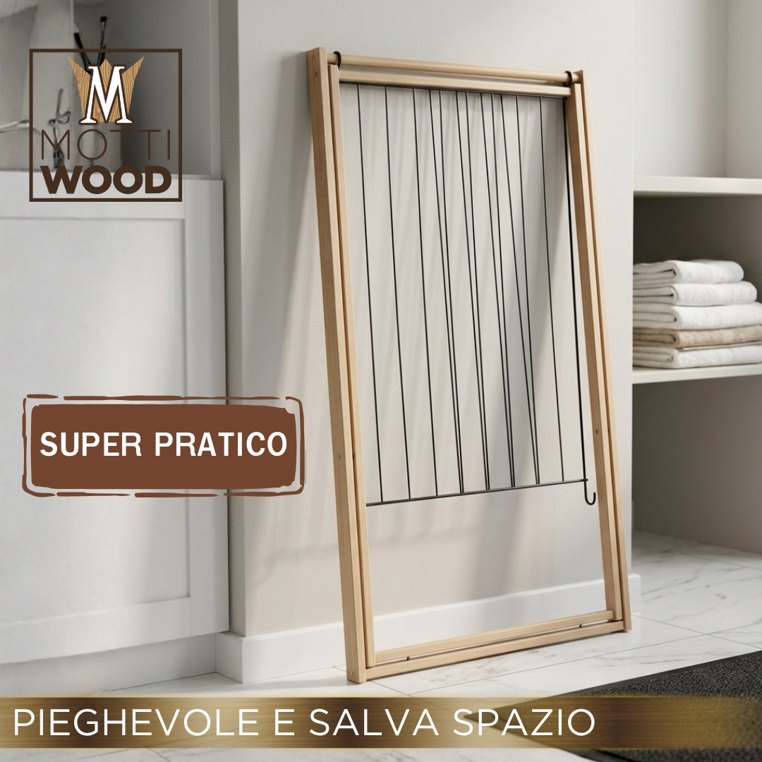 Stendibiancheria Pieghevole Mottiwood. Elegante, resistente e pratico con struttura completamente in legno di faggio è la scelta ideale per chi cerca qualità e funzionalità in un unico prodotto.